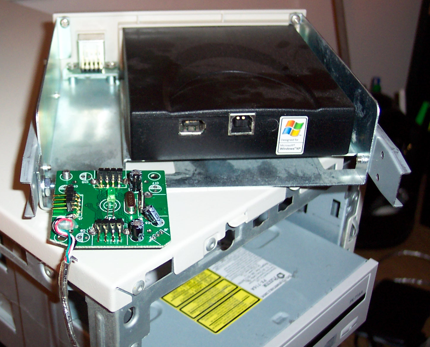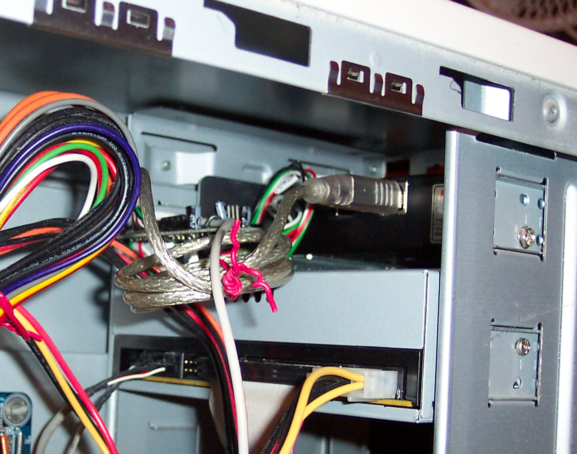 5. Connect the hub to motherboard. Note that the hub cable has changed colour. I tried to replace the USB connector with a plug to go directly to the motherboard. It was a failure since I didn't have the right part. After replacing the cable I decided to use an old USB port from an AT style case. You could also route the cable outside the case to a USB port.
